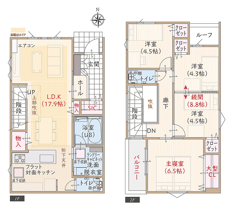 | 建物面積 | 94.41m2・96.06m2(28.55坪・29.05坪) | 土地面積 | 103.76m2・103.97m2(31.38坪・31.45坪) |