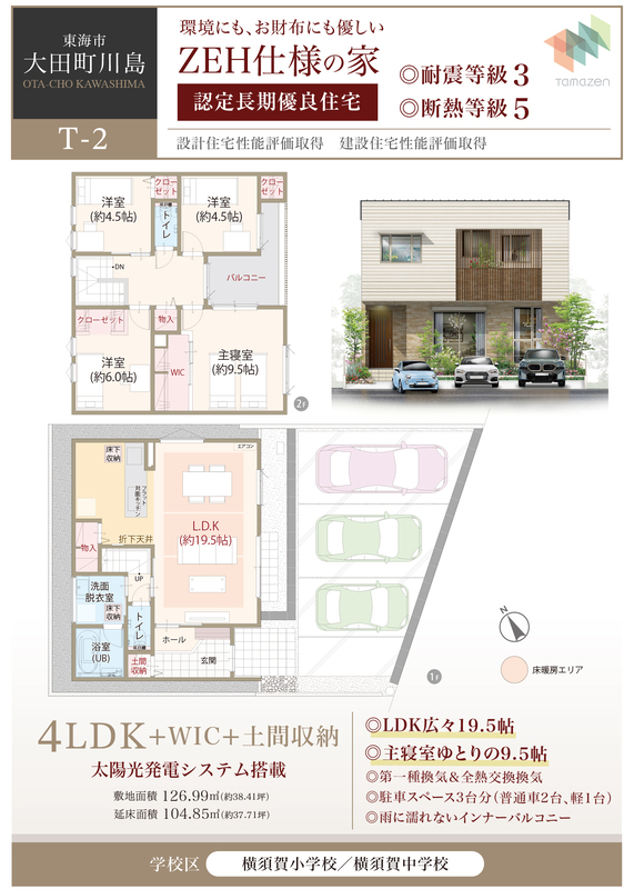 | 駐車場 | 2台 ~ 3台(2台(T-1)・3台(T-2)) | 道路の幅員 | 北側公道6.0m、南東側公道5.0m |