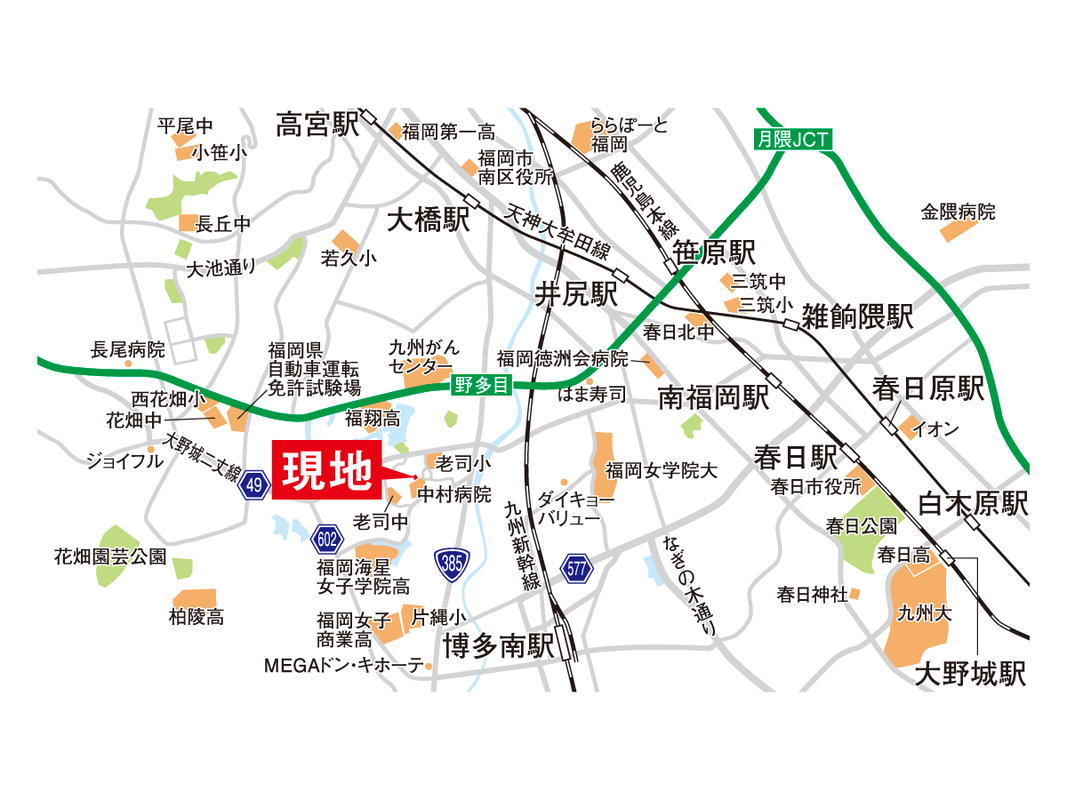 - 西鉄天神大牟田線「大橋」駅 西鉄バス27分「老司団地(2)」バス停 徒歩7分JR博多南線「博多南」駅 徒歩36分