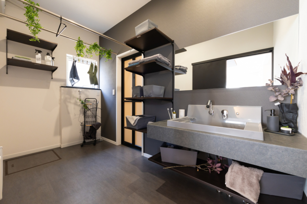 ■W1200の造作風洗面台にグレーボウルを採用