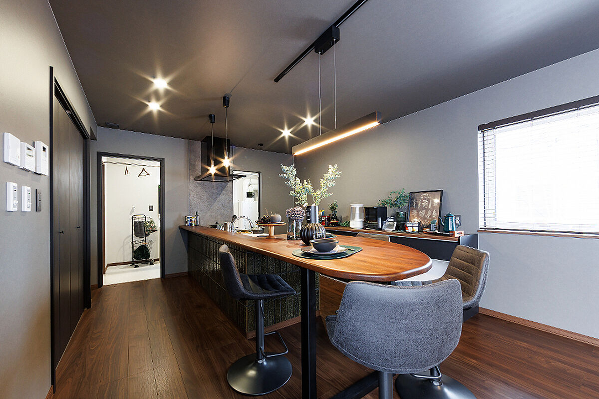 ・キッチン一体型のダイニングテーブルがアクセントに