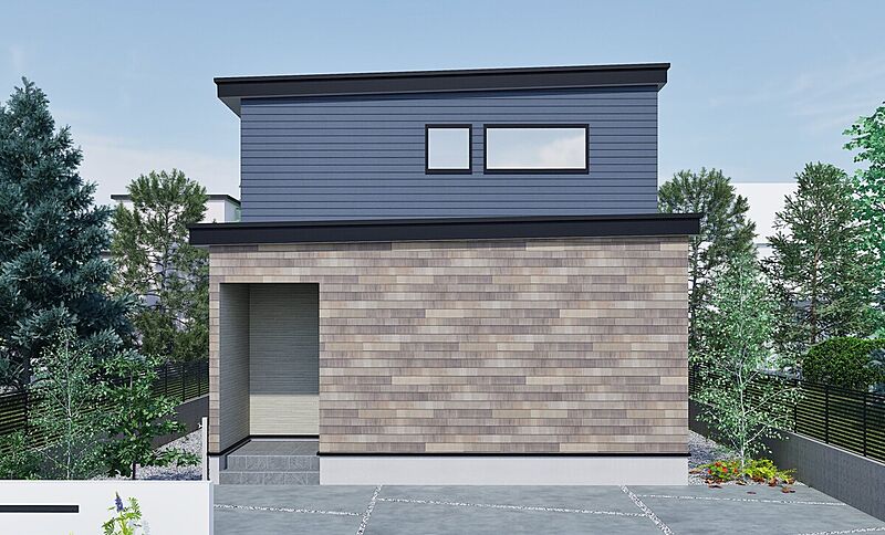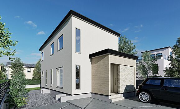 ■白を基調に素材を張り分けた外観の4LDK。