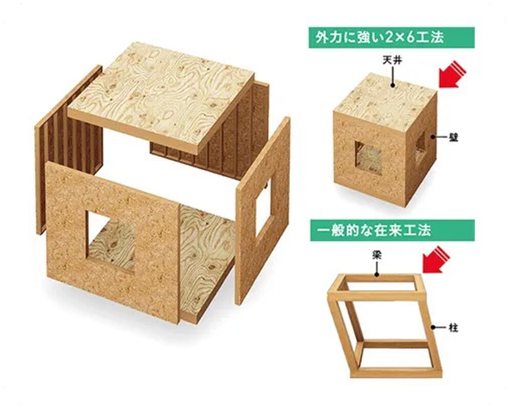 天井・壁・床の6面体全体で外部からの力に強い造り。
