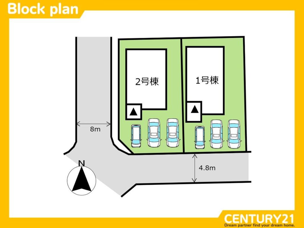 | 駐車場 | 有 カースペース2台可 | 道路の幅員 | 1号棟 南 4.8m、2号棟 角地 南 4.8m 西 8.0m |