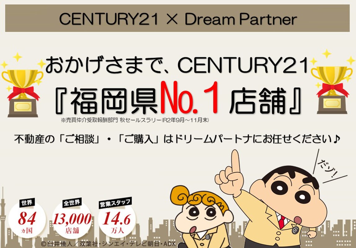 ◇◆◇センチュリー21ドリームパートナーならではのご提案◆◇◆ 弊社では、皆様にお得にお買い求め頂けるよう、最善の資金プランでご提案いたします。 賃貸でもマイホームでも毎月住居費は発生します。 安心して購入できる物件金額も「毎月のお支払いシュミレーション」を実施し、お住まいになるご家族様にとっての最善の方法を一緒に考えてサポートさせて頂きます。 分かりづらい不動産のご購入をお客様が安心して進められるように、お客様の立場に立ってお家を『探す』お手伝いをさせて頂きます。住まい探しはワクワクしながら楽しく探しましょう(^^♪ まずはお気軽にご内覧希望日時をお問合せ下さい。 もちろん平日・土日祝日・営業時間外でのご内覧や、ご希望の場所へのお迎えも可能です。 ----------------------------------------------------------------------------------------------- 「安心」と「信頼」をモットーに店舗ネットワークを拡大し、 世界83の国と地域に、11600店舗、13万人もの営業スタッフ(2020年6月末時点) これが世界最大級の不動産ネットワーク「センチュリー21」です! ----------------------------------------------------------------------------------------------- C21C21C21C21C21C21C21C21C21C21C21C21C21C21C21C21C21C21C21C21C21 センチュリー21/ドリームパートナー 〒811-1314 福岡県大野城市山田2丁目14-1 メールでのお問合せ:info@dreamptr.com 物件情報満載⇒ http://www.dreamptr.com C21C21C21C21C21C21C21C21C21C21C21C21C21C21C21C21C21C21C21C21C21 |