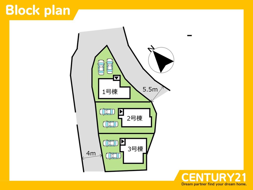 | 駐車場 | 有 カースペース2台 | 道路の幅員 | 1号棟 西 4.0m 東 5.5m、2,3号棟 西 4.0m |