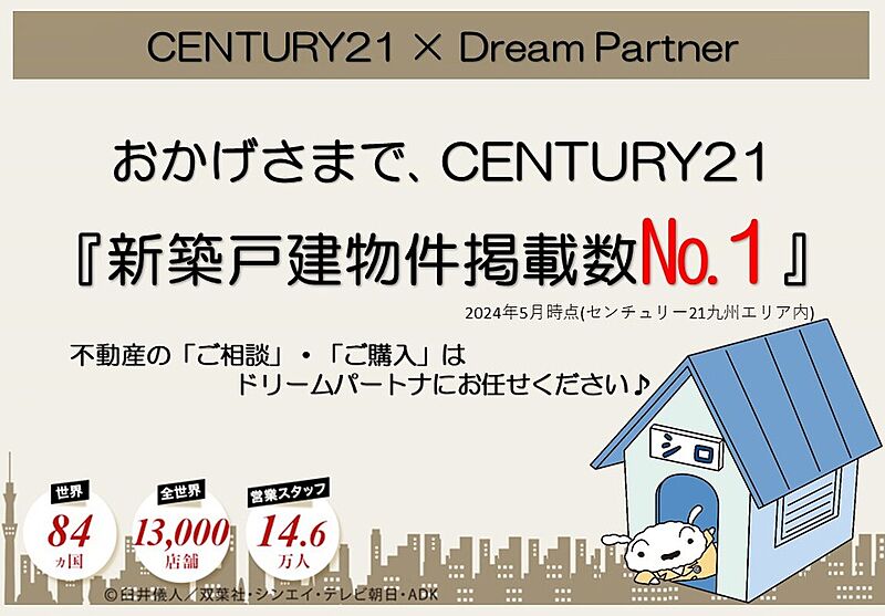 ◇◆◇センチュリー21ドリームパートナーならではのご提案◆◇◆ 弊社では、皆様にお得にお買い求め頂けるよう、最善の資金プランでご提案いたします。 賃貸でもマイホームでも毎月住居費は発生します。 安心して購入できる物件金額も「毎月のお支払いシュミレーション」を実施し、お住まいになるご家族様にとっての最善の方法を一緒に考えてサポートさせて頂きます。 分かりづらい不動産のご購入をお客様が安心して進められるように、お客様の立場に立ってお家を『探す』お手伝いをさせて頂きます。住まい探しはワクワクしながら楽しく探しましょう(^^♪ まずはお気軽にご内覧希望日時をお問合せ下さい。 もちろん平日・土日祝日・営業時間外でのご内覧や、ご希望の場所へのお迎えも可能です。 ----------------------------------------------------------------------------------------------- 「安心」と「信頼」をモットーに店舗ネットワークを拡大し、 世界83の国と地域に、11600店舗、13万人もの営業スタッフ(2020年6月末時点) これが世界最大級の不動産ネットワーク「センチュリー21」です! ----------------------------------------------------------------------------------------------- C21C21C21C21C21C21C21C21C21C21C21C21C21C21C21C21C21C21C21C21C21 センチュリー21/ドリームパートナー福岡 〒813-0004 福岡県福岡市東区松香台2丁目1-25 メールでのお問合せ:info@dreamptr.com |