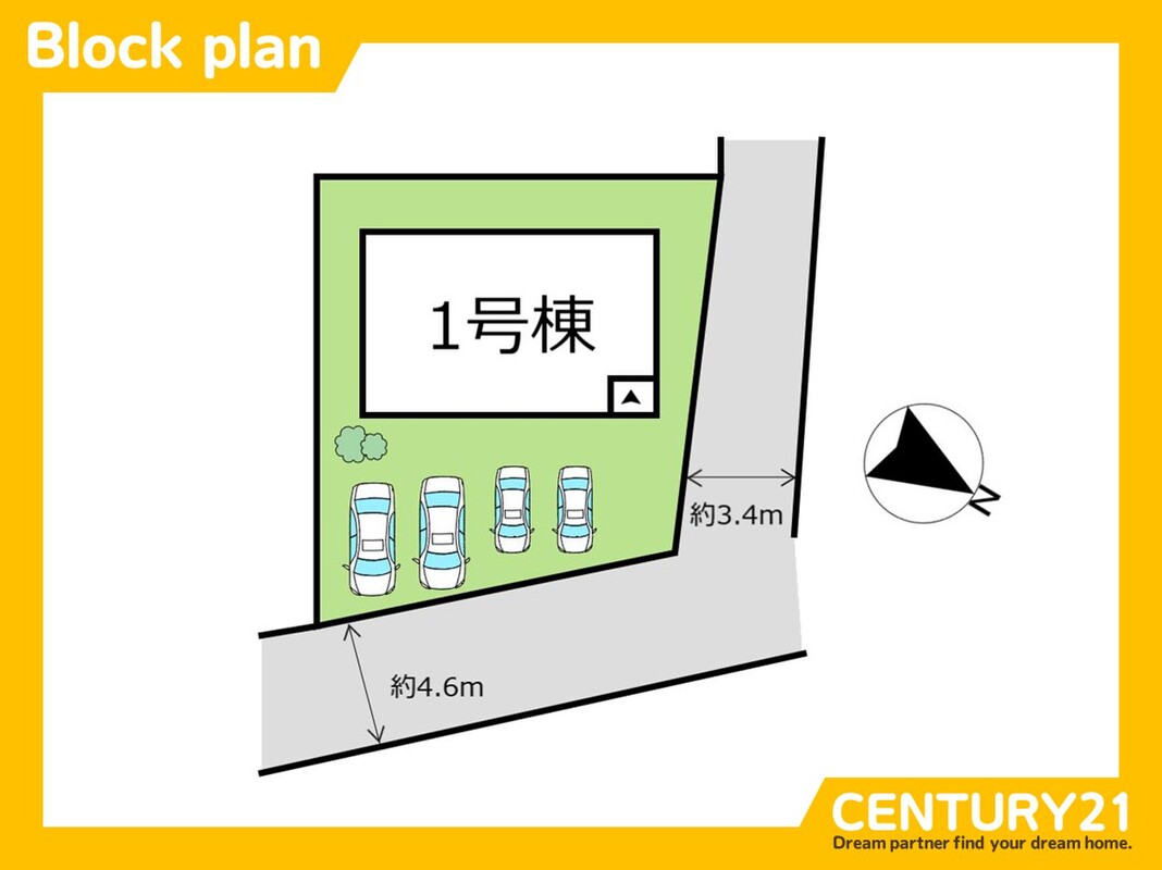 | 駐車場 | 駐車4台可 | 道路の幅員 | 北 3.4m、 東 4.6m |