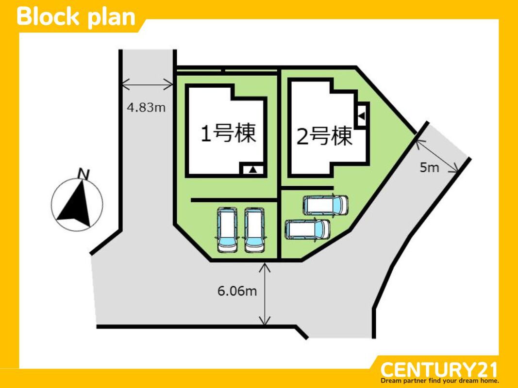 | 駐車場 | 有 カースペース2台可 | 道路の幅員 | 1号棟 角地 西 4.83m 南 6.06m、2号棟 角地 東 5.0m 南 6.06m |