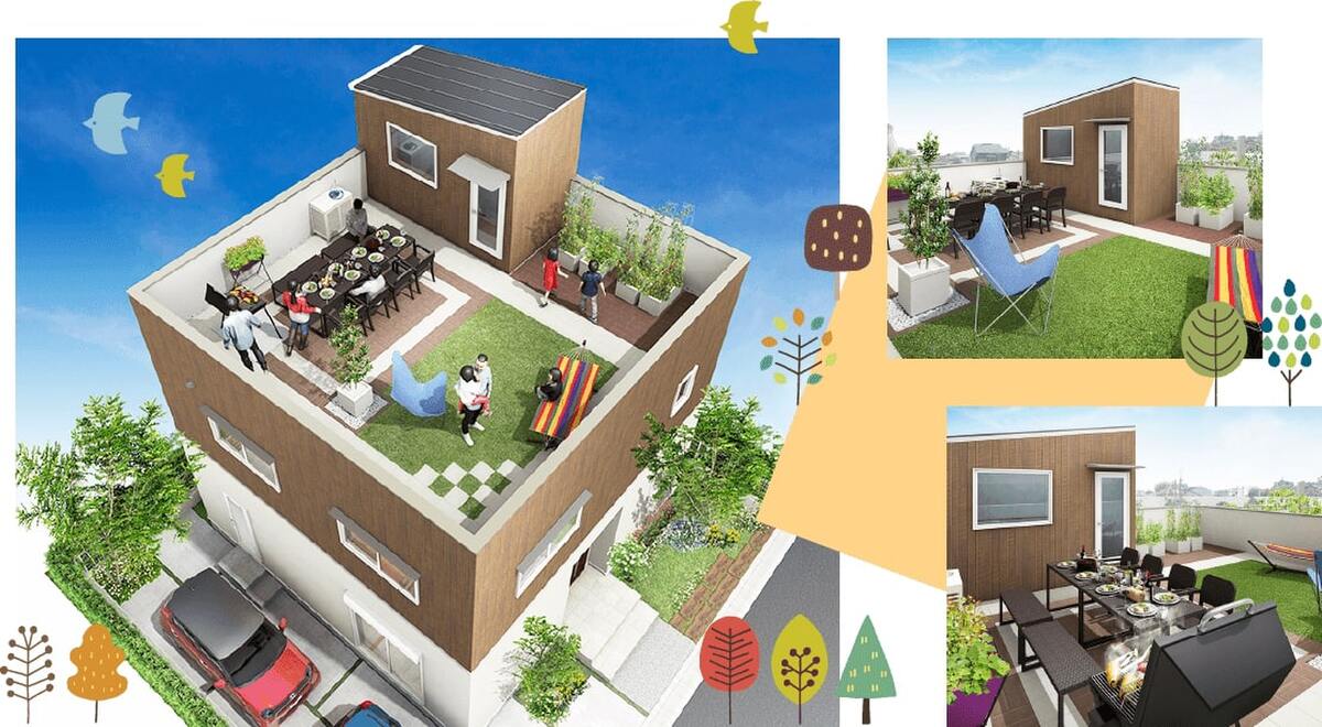 【満足と安心の住まい】建物は耐震・制震にこだわった特別仕様となっており、間取りも生活者を第一に考えご満足の頂ける創りとなっております!屋上にはプライベート空間を創造する「そら庭」を採用しております。