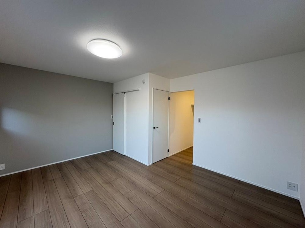 グレーのアクセントクロスが室内に奥行きを感じさせてくれます。大きめのベッドを配置してもゆとりのある広さで、デスクやドレッサーなども設置できます。