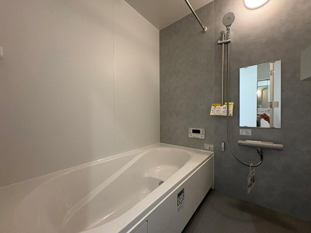 グレーのアクセントパネルが施された、落ち着いた雰囲気の浴室。浴槽はベンチタイプのため、半身浴やお子様のステップとしてご活用いただけます。浴室乾燥機付き。