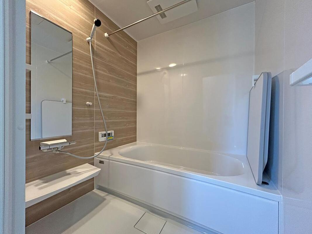 リラックス感のある落ち着いたカラーが採用された浴室。雨の日や花粉の時期に重宝する浴室乾燥機付きです。/2025年7月撮影