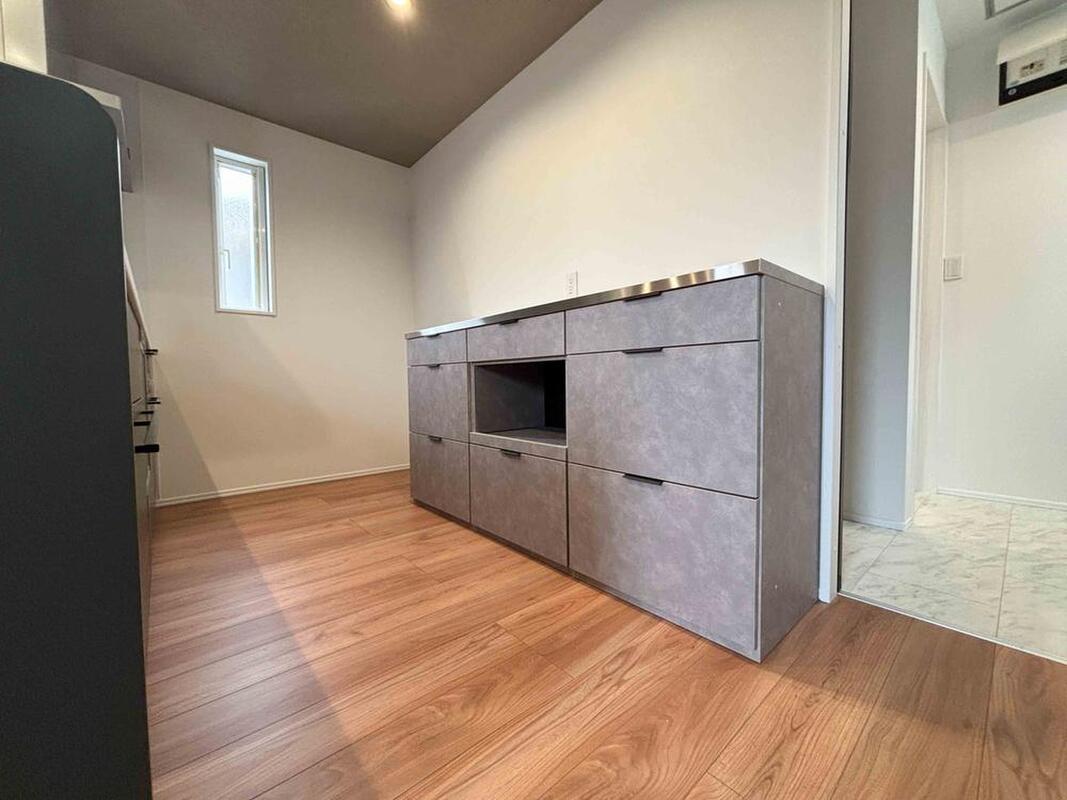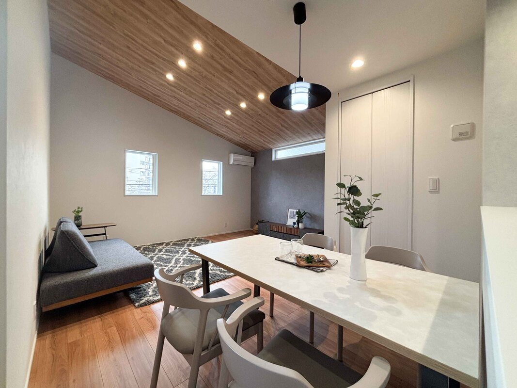 勾配天井が施された約18.0帖のLDK。空間にメリハリをもたらします。2階リビングのため、道路からの視線を気にせずゆっくりと過ごしていただけます。/2026年3月撮影