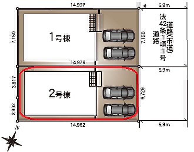 | 駐車場 | 2台 | 道路の幅員 | 南東側5.9m公道 |