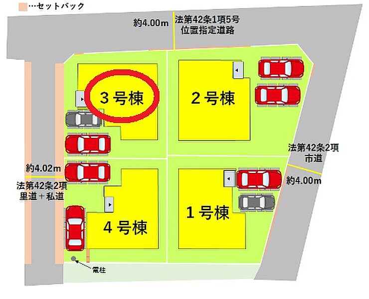 | 駐車場 | 2台 | 道路の幅員 | 北側4.0m私道 |