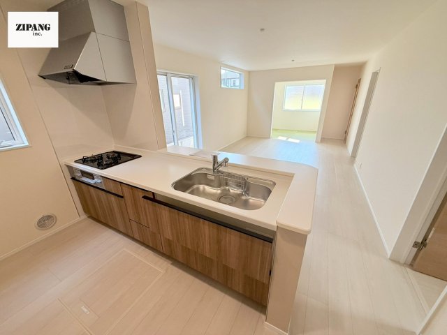 【キッチン】お子さまや家族と距離感近く料理が可能な対面式のシステムキッチンです。3口コンロのキッチンでお料理のレパートリーが増えそうです♪