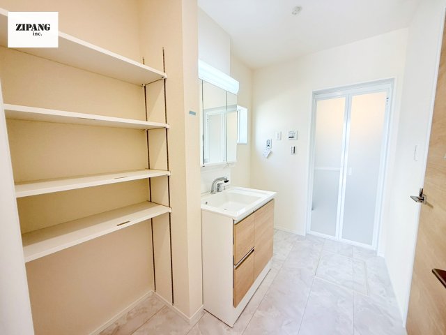 【洗面化粧台】三面鏡付きの洗面化粧台。曇り止め付きのミラーキャビネットを採用。ミラーの内側は収納になっており歯磨きセットなどの保管に便利です。