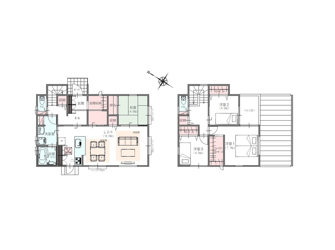 | 間取り | 4LDK+WIC | 建物構造 | 木造ガルバリウム鋼板ハゼ葺2階建 |