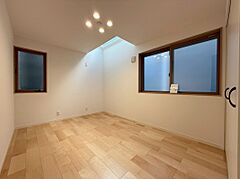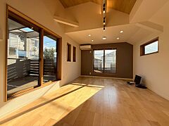 南道路約6.2m公道に面す、温かい陽光が室内全体にサンサンと降り注ぎます。リビング上部を吹抜にする事で更なる採光を確保、開放感も演出しております。一番過ごす場所だからこそLDKの快適性に拘りました。