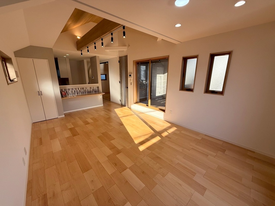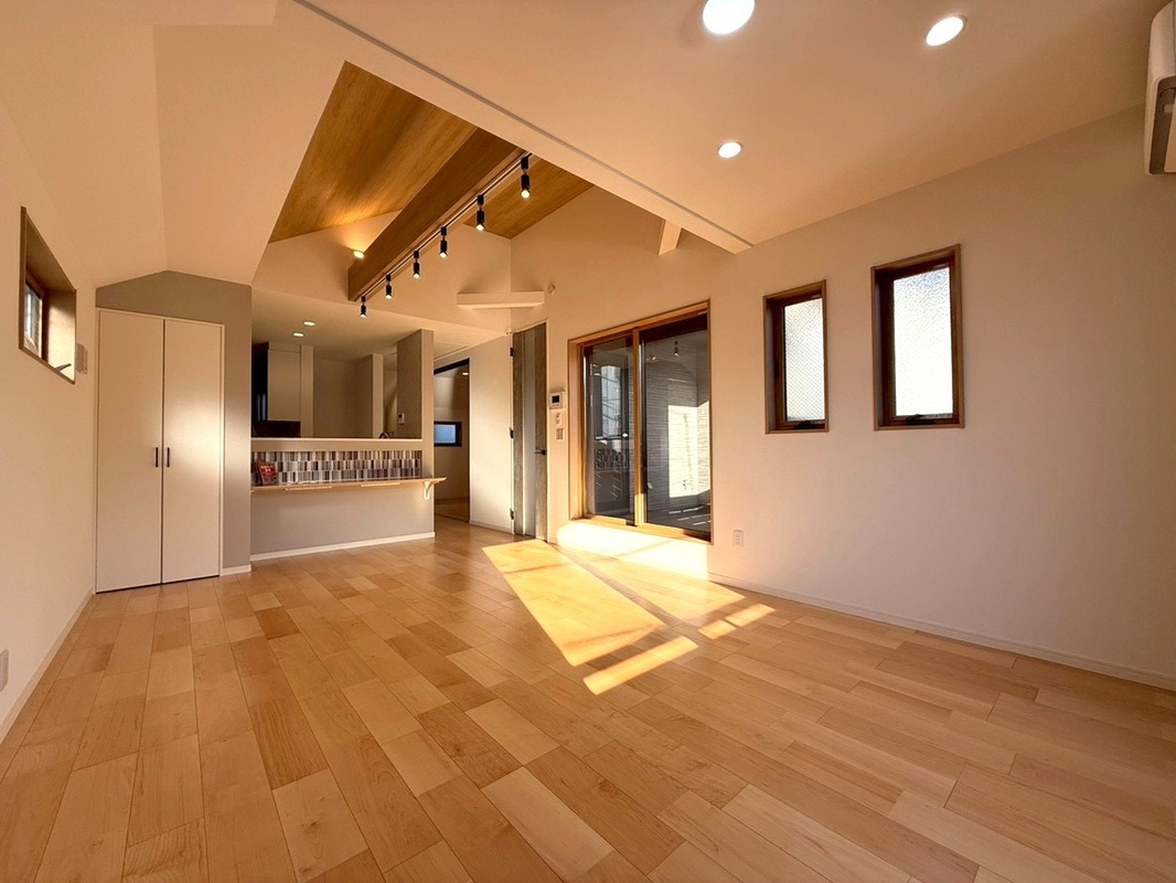 南道路約6.2m公道に面す、温かい陽光が室内全体にサンサンと降り注ぎます。リビング上部を吹抜にする事で更なる採光を確保、開放感も演出しております。一番過ごす場所だからこそLDKの快適性に拘りました。