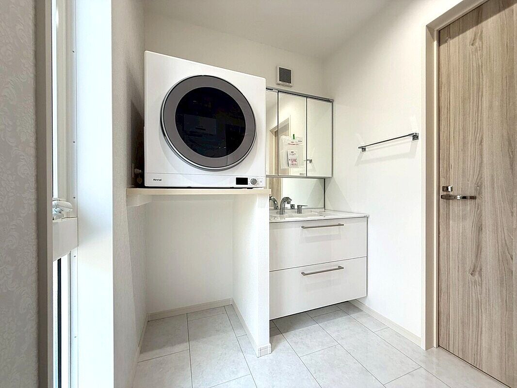 明るい玄関にはシューズクロークを設置し、スッキリした空間を保てます。シューズボックスには姿見がございます。身だしなみを最終チェックしてお出かけください。