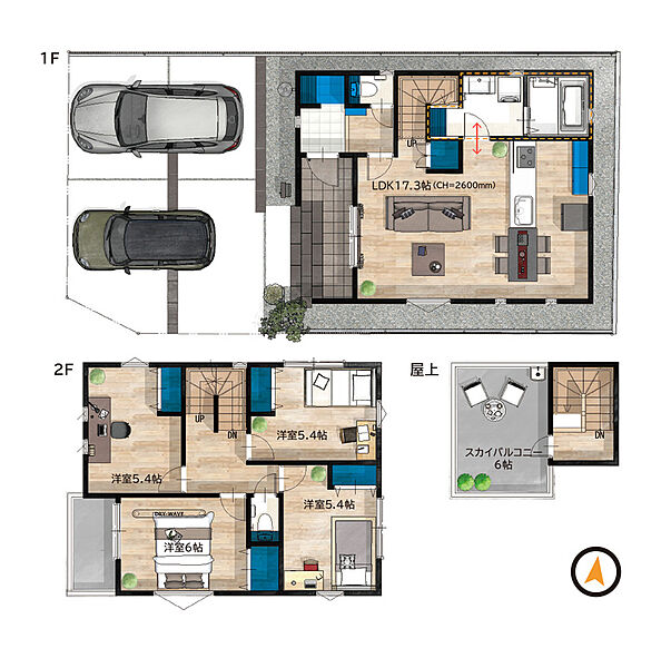 特別空間「屋上バルコニー」×開放感抜群の「天井高2.6m」×ご来客時も便利な「駐車場2台」