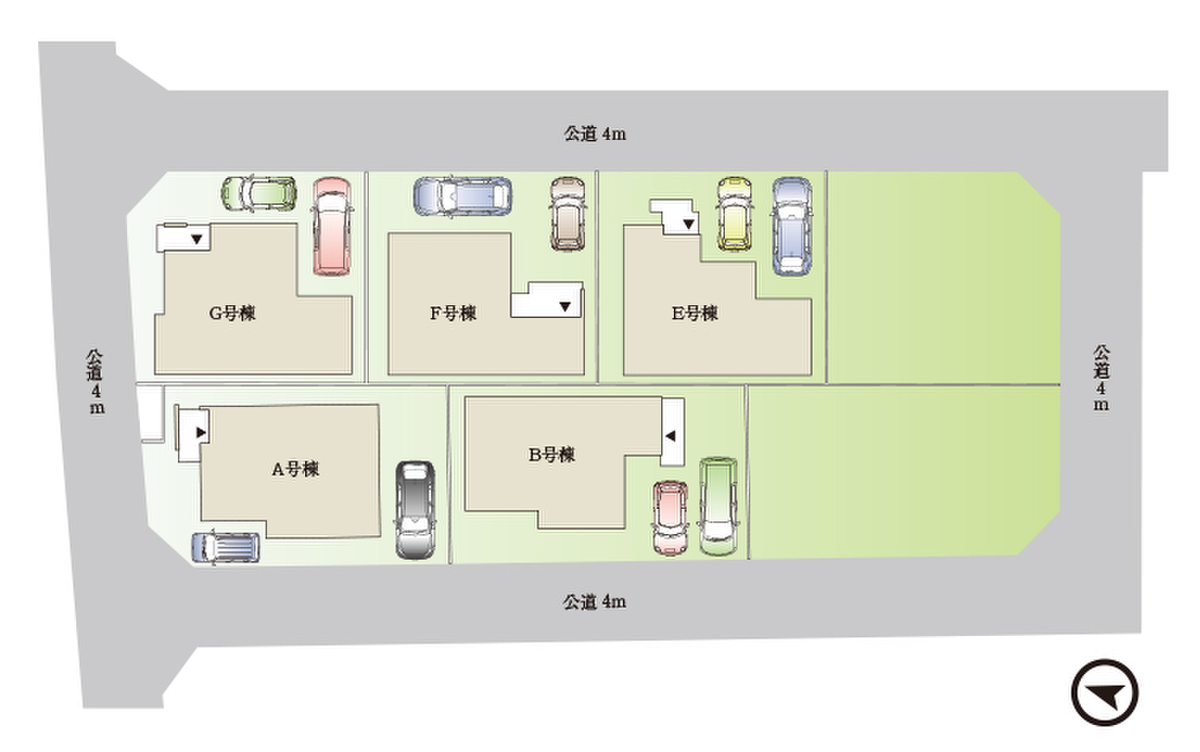 | 駐車場 | 2台 | 道路の幅員 | 北側4m、南側4m、東側4m、西側4m |