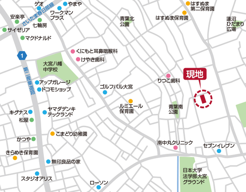 東武野田線「大和田」駅 徒歩24分 JR京浜東北・根岸線「大宮」駅 国際興行バス15分「南中野」バス停 徒歩15分 JR東北本線「土呂」駅 車で約4.7km |
