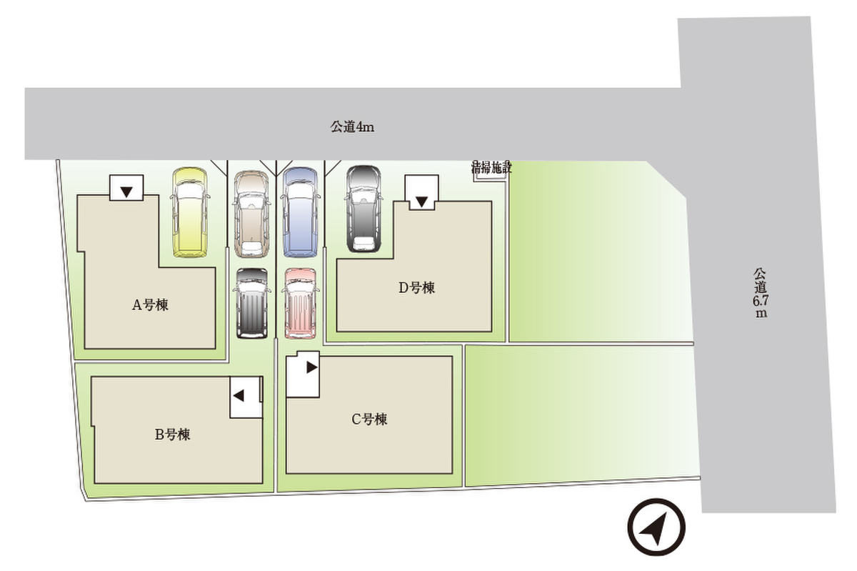 | 駐車場 | 1台 ~ 2台 | 道路の幅員 | 北側4m、東側6.7m |