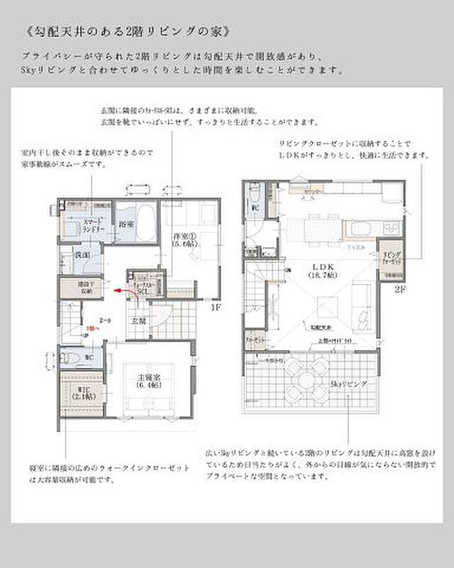 ◎ 単身も夫婦も快適に暮らせる設計 特徴・設備 ■ 勾配天井リビング・Skyリビングで開放感 ■ 防犯カメラ・食洗機・浴室乾燥機など充実設備 ■ 省エネ性能住宅で安心&快適