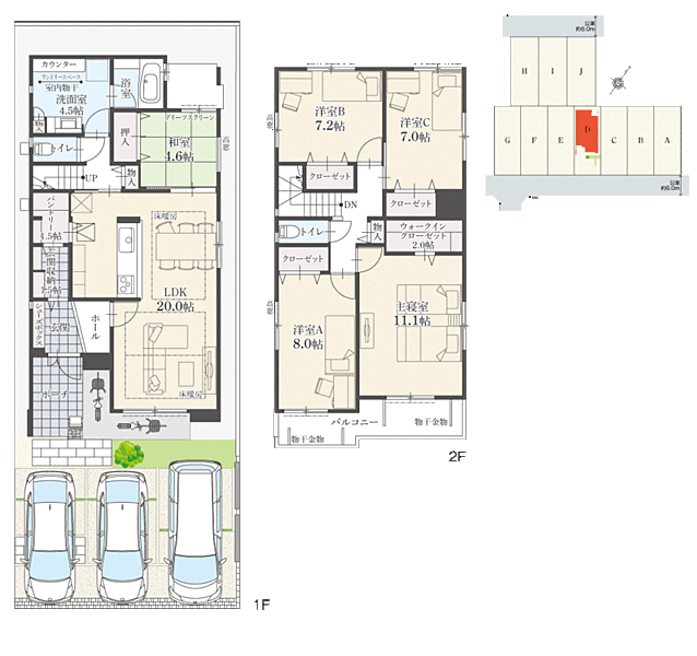 耐震等級3・長期優良住宅・敷地46坪以上・南側接道(D・E棟)・駐車3台可能