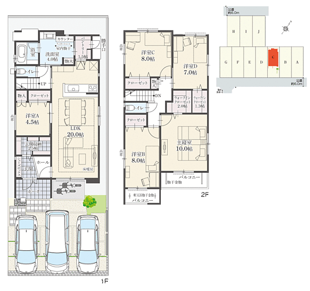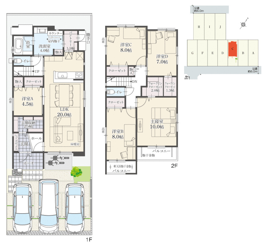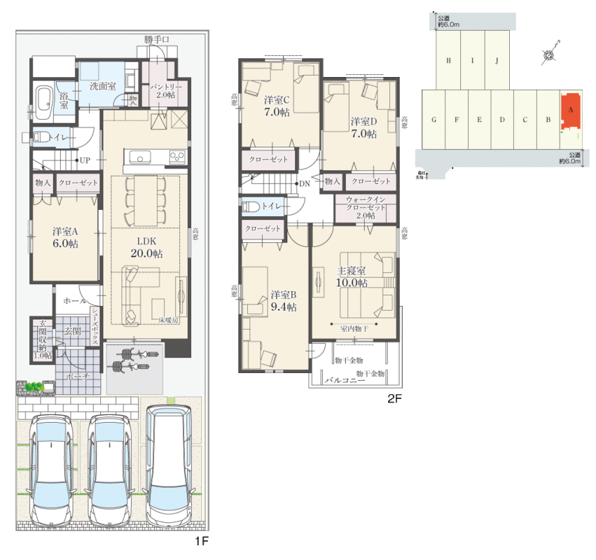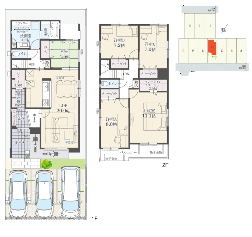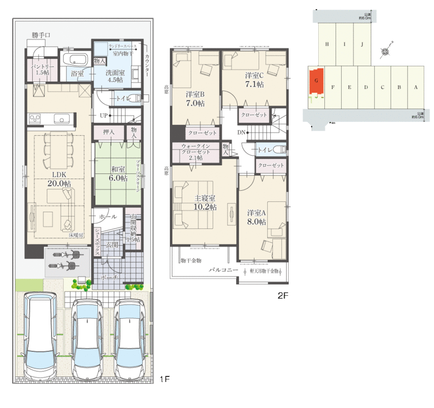 耐震等級3・長期優良住宅・敷地46坪以上・南東側接道(A棟~G棟)・駐車3台可能