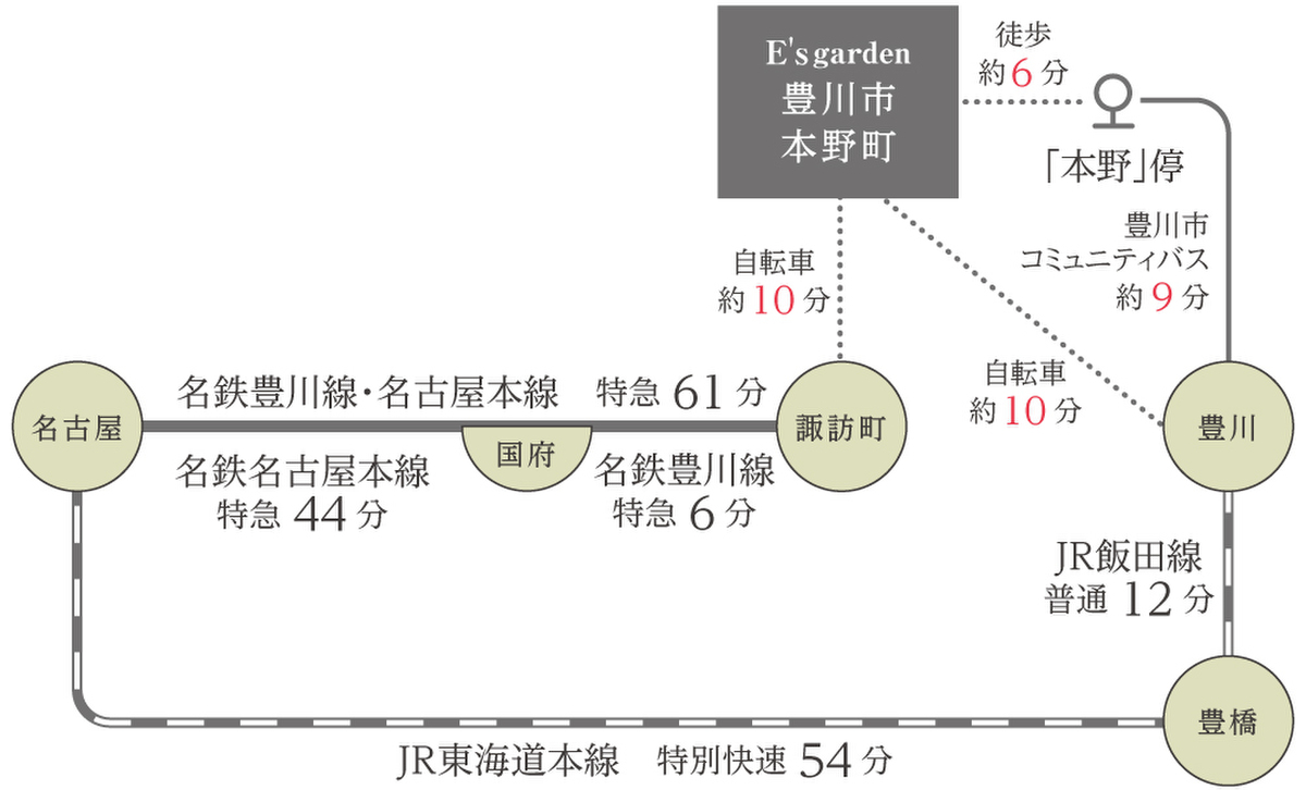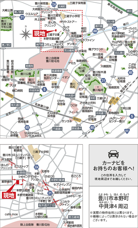 名鉄豊川線「諏訪町」駅 徒歩30分 自転車約10分 JR飯田線「豊川」駅 徒歩31分 自転車約10分 豊川コミュニティバス「本野」停 徒歩6分 |