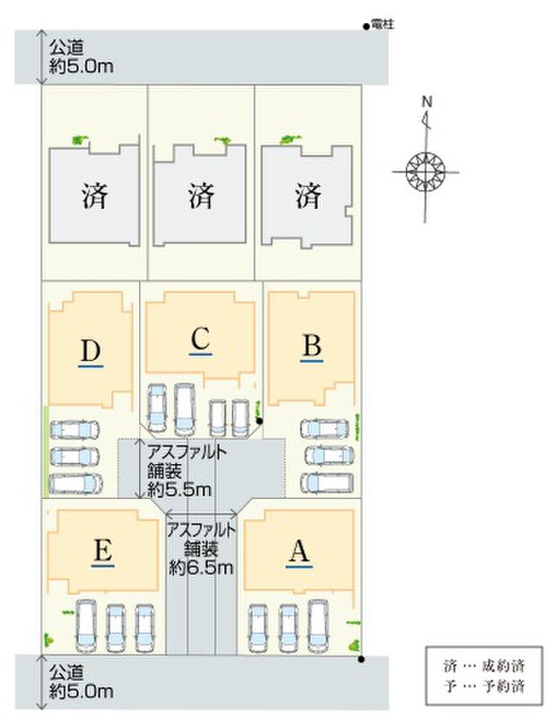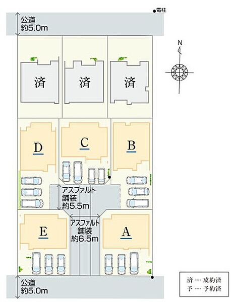 | 駐車場 | 3台 ~ 4台(A・B・D・E棟(3台)、C棟(4台) ※私道負担有(詳細は備考)) | 道路の幅員 | 公道南側約5.0m |