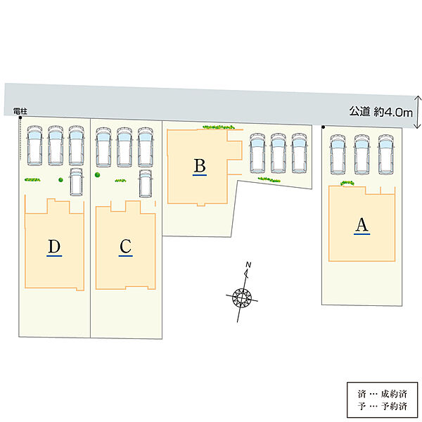 | 駐車場 | 3台 ~ 4台(A棟・B棟(3台)、C棟・D棟(4台)) | 道路の幅員 | 北側約4.0m公道 |