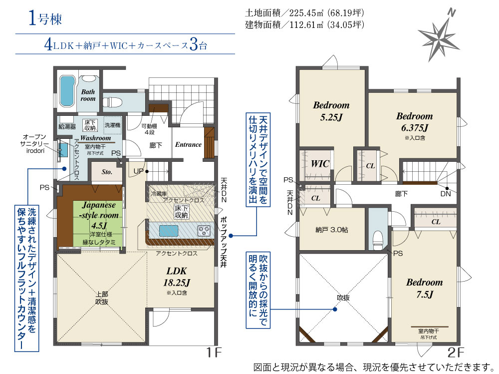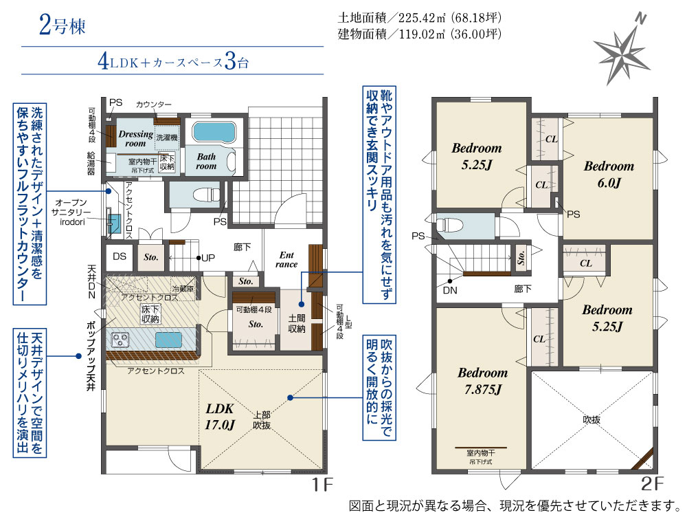 | 建物面積 | 112.61m2(約34.06坪)~119.02m2(約36.00坪) | 土地面積 | 222.45m2(約67.29坪)~225.42m2(約68.18坪) |
