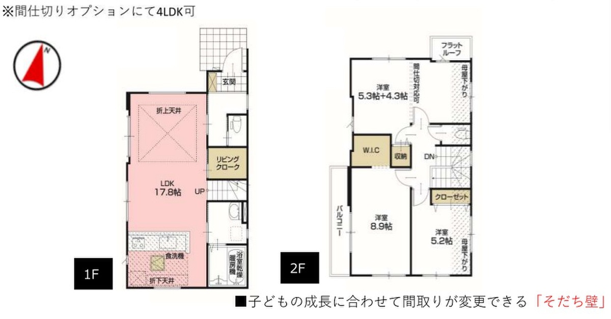 - 1・4号棟:4LDK、3号棟:3LDK※間仕切りオプションで4LDK可