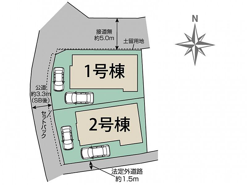 【接道】西3.3m公道(SB後)、南1.5m法定外道路 【設備】公営水道、東京電力、都市ガス、本下水 【その他法令】22条区域、景観法、宅地造成及び特定盛土等規制法、文化財保護法 【その他持分】【SB部分持分】5.76m2(1号棟)【SB部分持分】5.73m2(2号棟) |