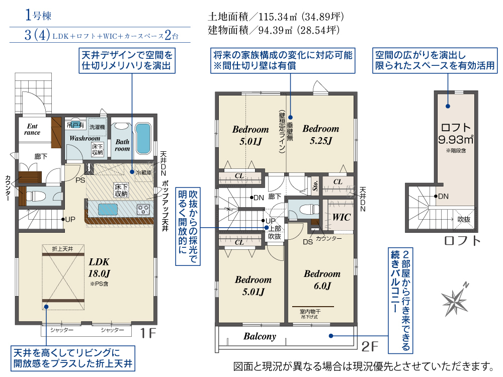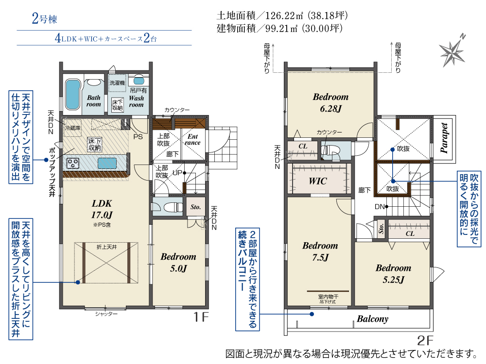 | 建物面積 | 94.39m2(約28.55坪)~99.21m2(約30.01坪) | 土地面積 | 115.34m2(約34.89坪)~126.22m2(約38.18坪) |