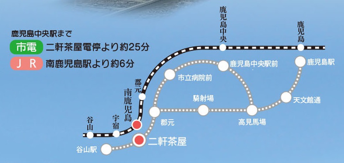 鹿児島市電1系統「二軒茶屋」駅 徒歩1分~1分 JR指宿枕崎線「南鹿児島」駅 徒歩9分~9分 |