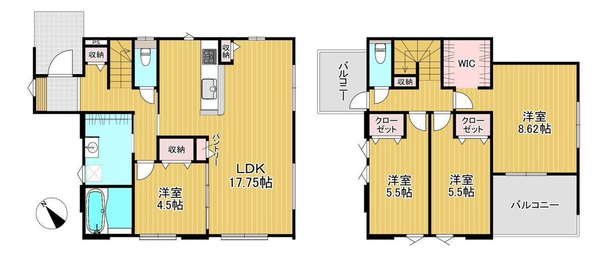 | 建物面積 | 106.76m2・112.24m2 | 土地面積 | 134.53m2・142.14m2 |