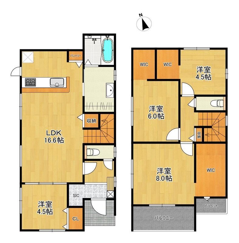 | 建物面積 | 104.33m2・108.91m2 | 土地面積 | 124.20m2・143.57m2 |