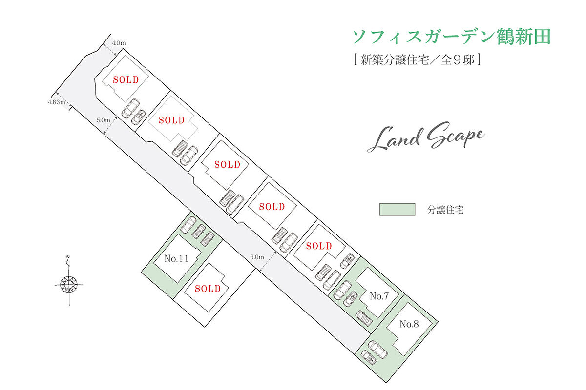| 駐車場 | 2台 ~ 3台 | 道路の幅員 | 南側幅員約5~6m位置指定道路、5~10号地私道負担あり |