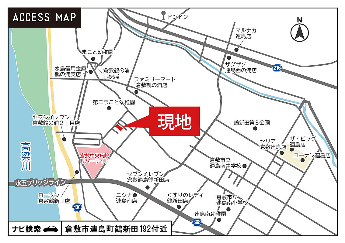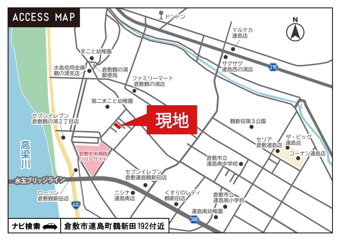 周辺施設■ファミリーマート倉敷鶴の浦店まで 徒歩6分/ 420~450m■倉敷中央病院リバーサイドまで 徒歩8分/ 560~590m■ニシナ連島南店まで 徒歩10分/ 730~760m