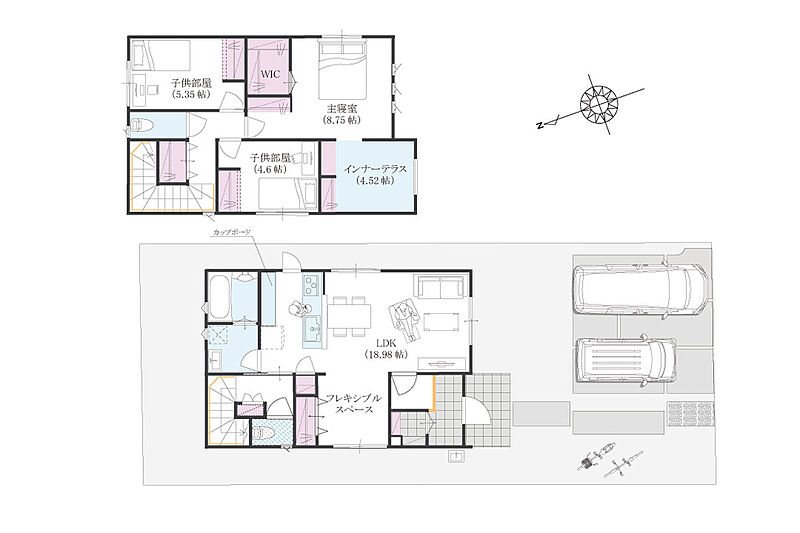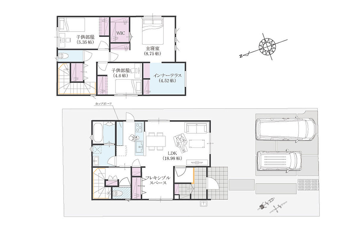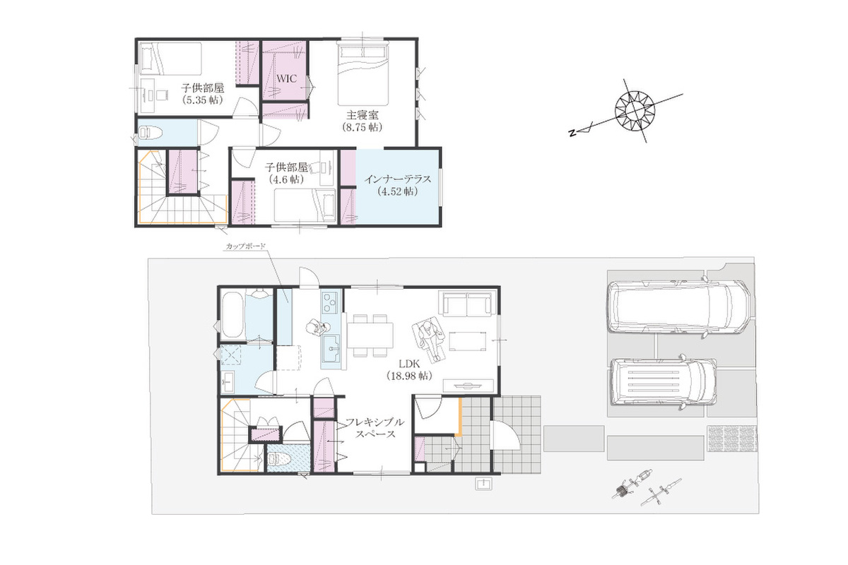 | 建物面積 | 102.50m2(1号地)・109.24m2(2号地) | 土地面積 | 159.85m2(1号地)・160.03m2(2号地) |