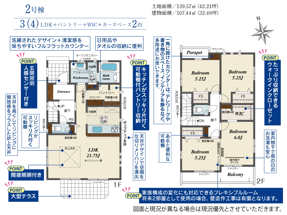 | 建物面積 | 107.44m2(約32.50坪) | 土地面積 | 139.57m2(約42.21坪) |