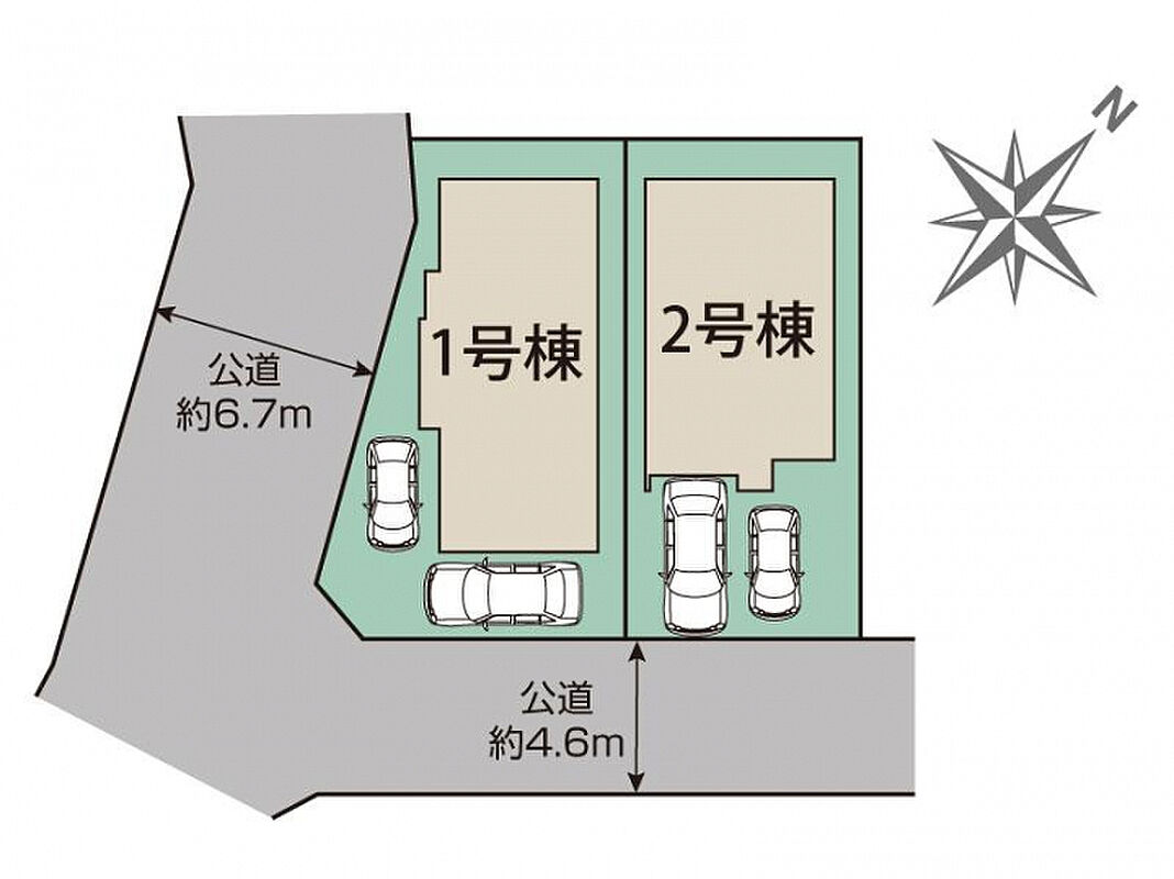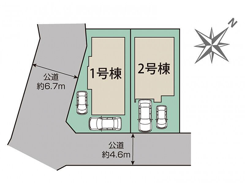 | 駐車場 | 2台 | 道路の幅員 | 南東4.6m公道、南西6.7m公道 |