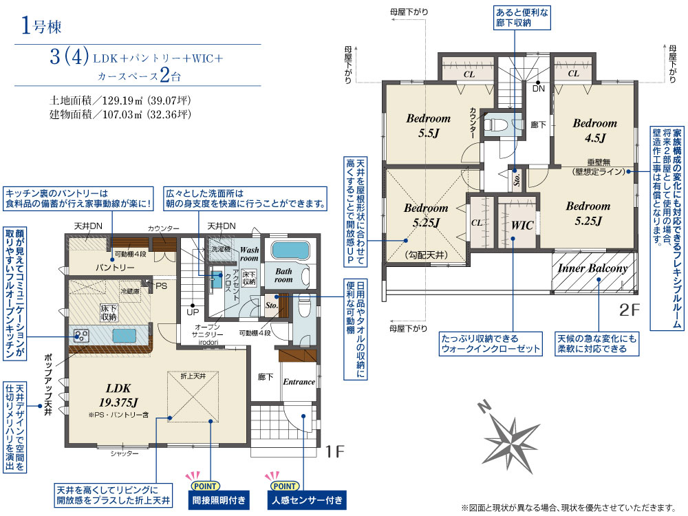 | 建物面積 | 107.03m2(約32.37坪) | 土地面積 | 129.19m2(約39.07坪) |