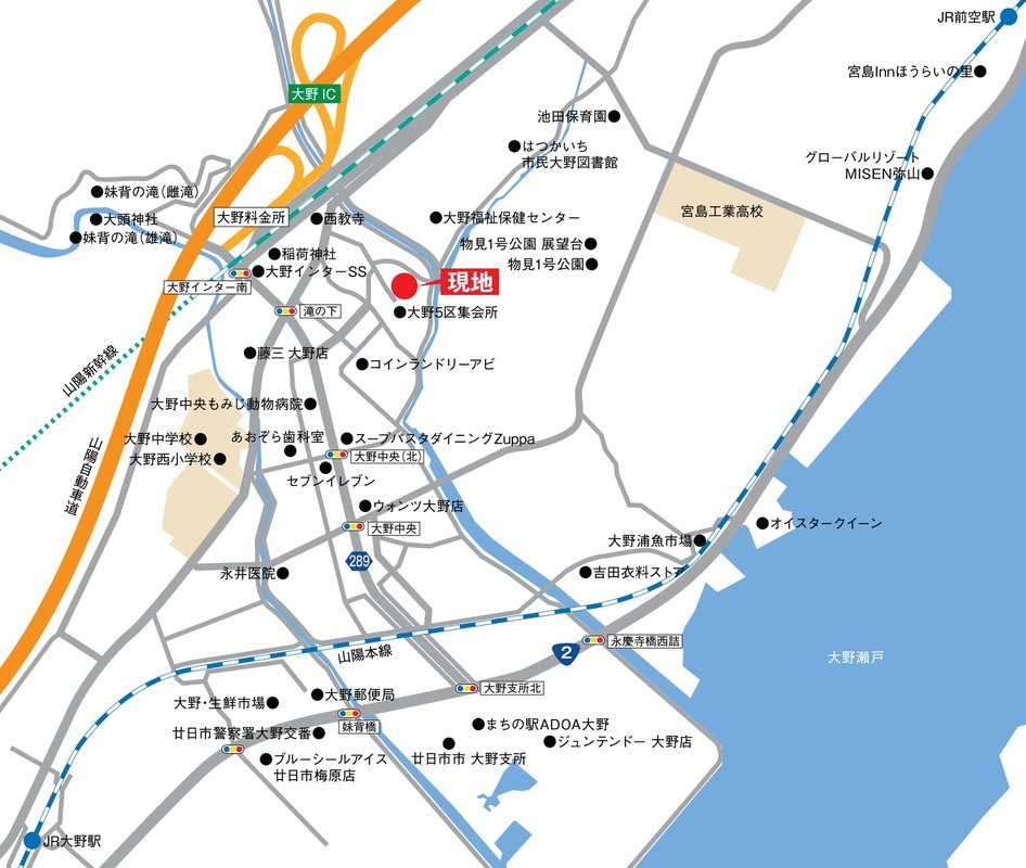 おおのハートバス「まるくる大野」バス停 徒歩5分 JR山陽本線「大野浦」駅 徒歩21分 |